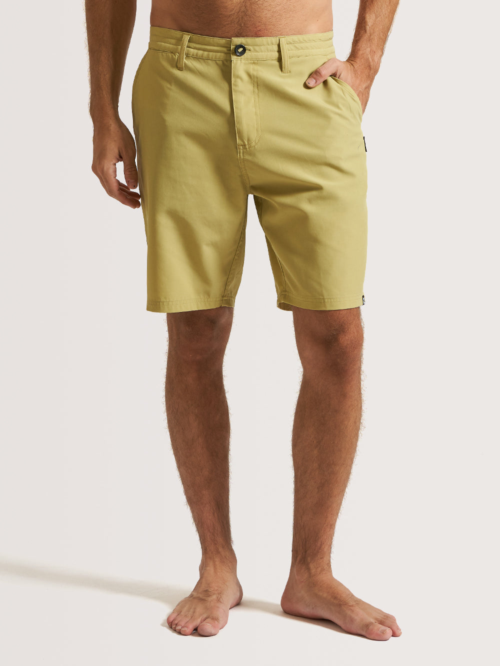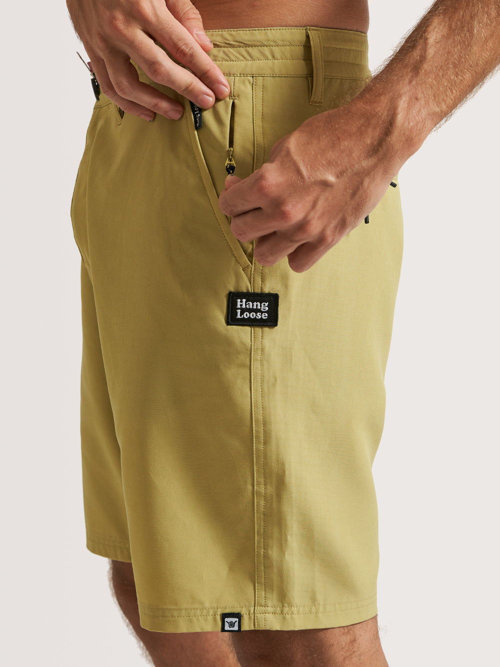 Bermuda Híbrida Hang Loose Stoked, possui tecido 4 Way Stretch com efeito stone liso, cós com passantes, vista frontal com zíper e fechamento de botão, bolsos faca frontal, bolsos embutidos traseiro e aplicação de etiqueta na lateral.
