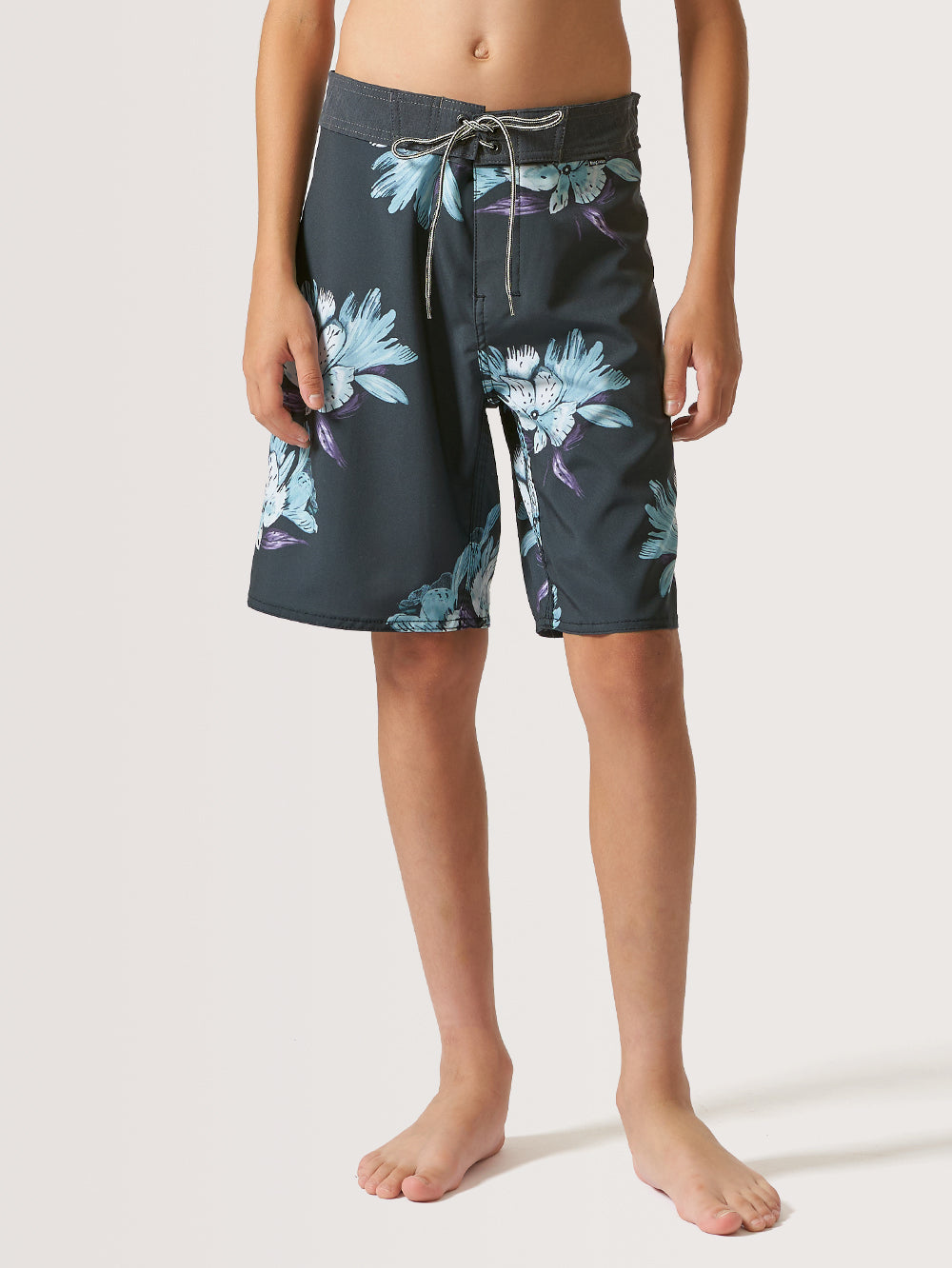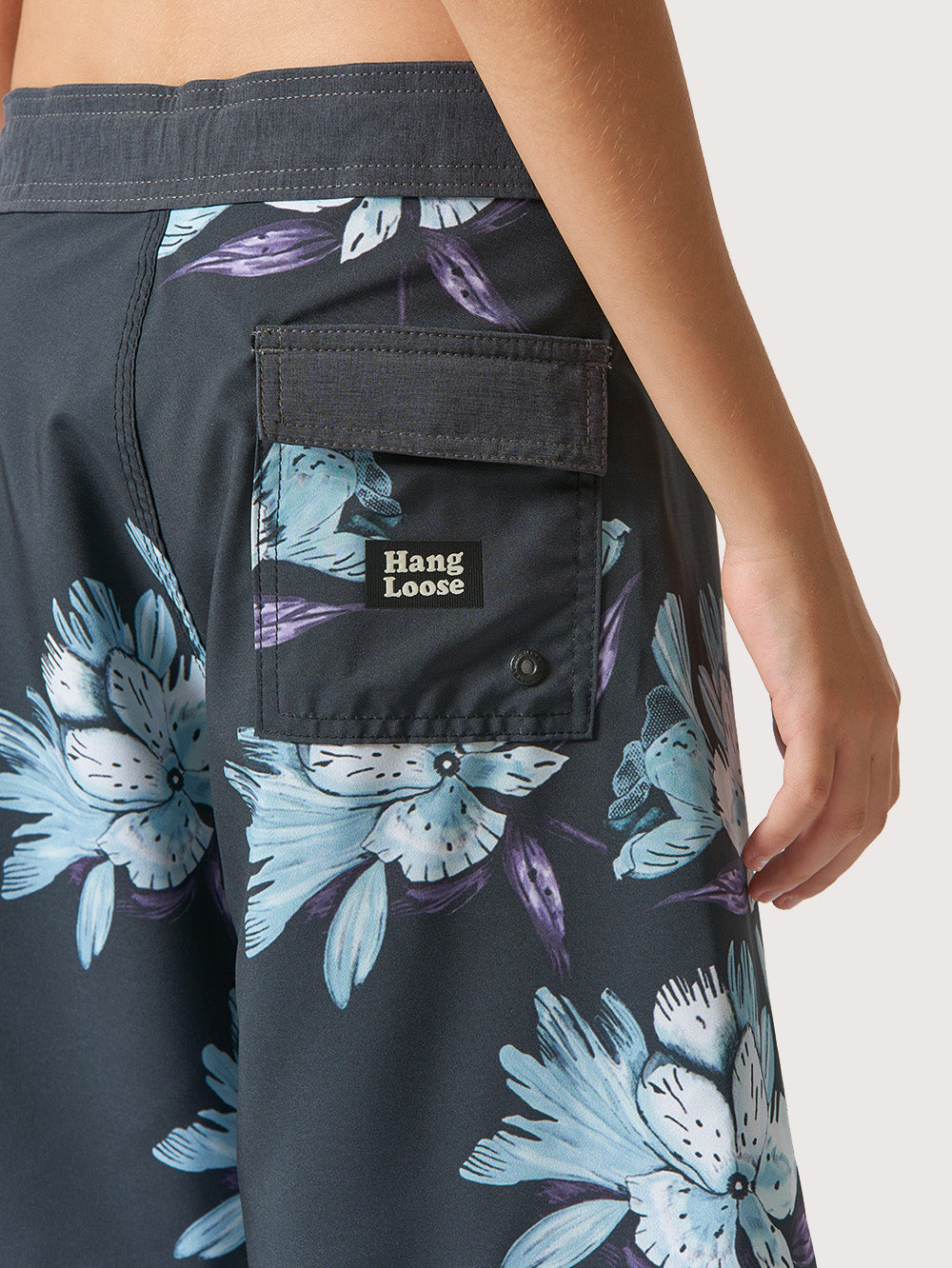 Boardshort Juvenil Hang Loose Flow, possui ilhós personalizado, cós com ajuste de cordão frontal, recorte nas laterais com silk, bolso traseiro chapado e com aplicação de etiqueta. Confeccionado em tecido 4 Way Stretch.