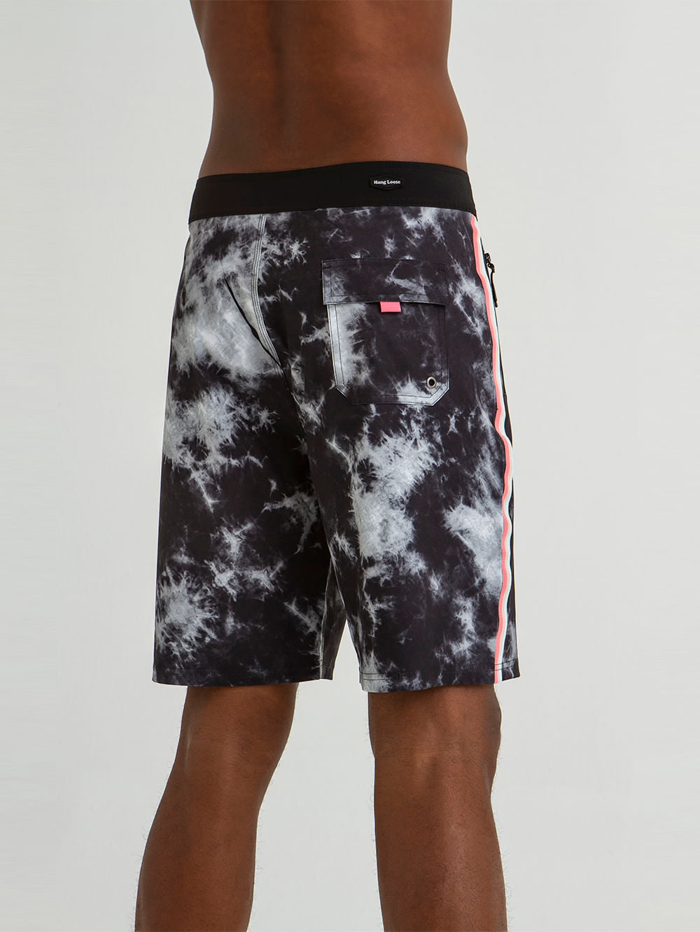 Boardshort Hang Loose Tie Dye Preto "19.5". Confeccionado em 92% de Poliéster reciclado e 8% elastano, o boardshort Tie Dye possui tecido 4-Way Stretch tecnológico, proporcionando mais conforto e flexibilidade. Também dispoem de ajuste frontal com amarração, bolso traseiro, bolso lateral com zíper, patch frontal e cordão com silicone para melhor amarração.