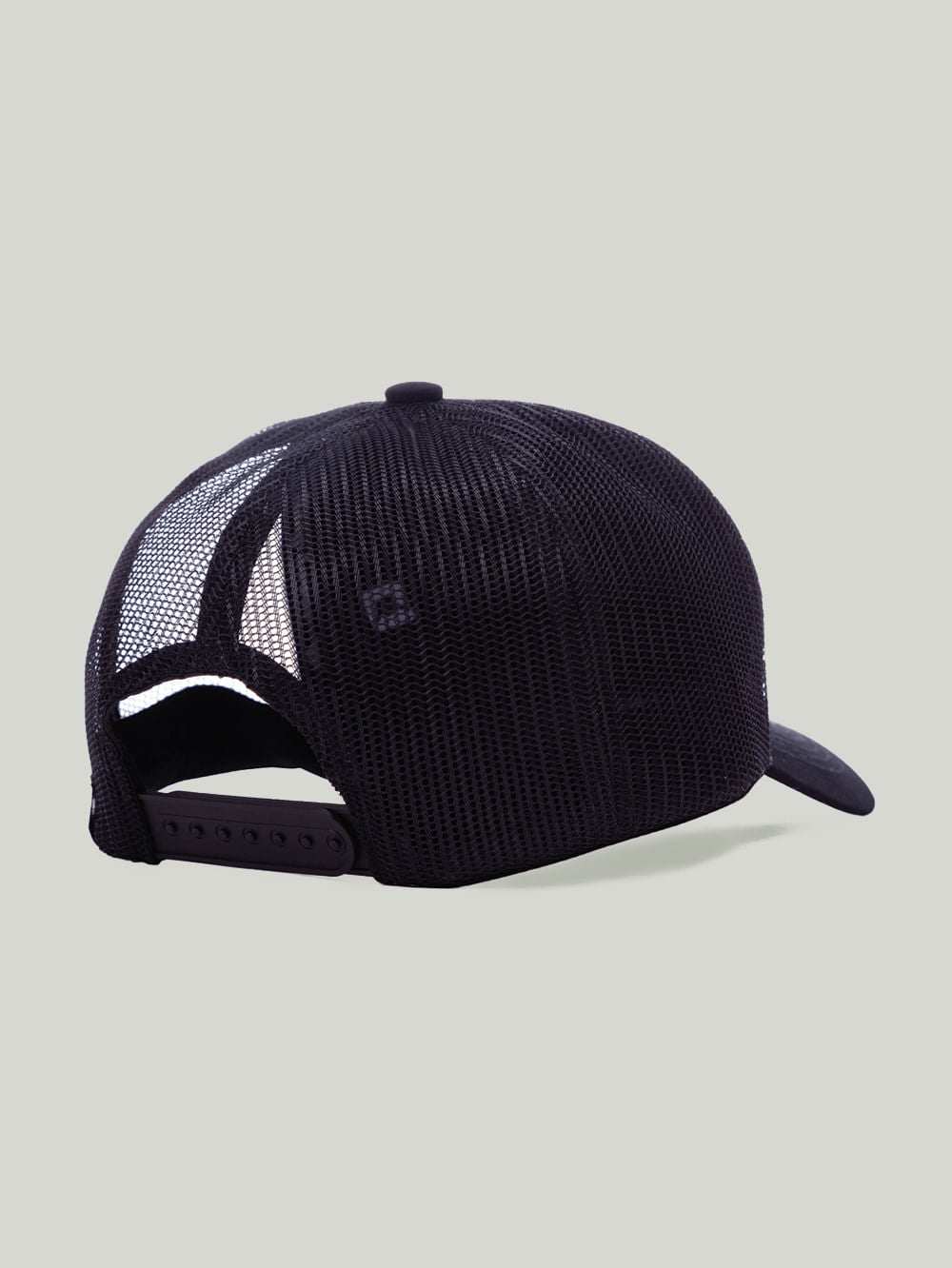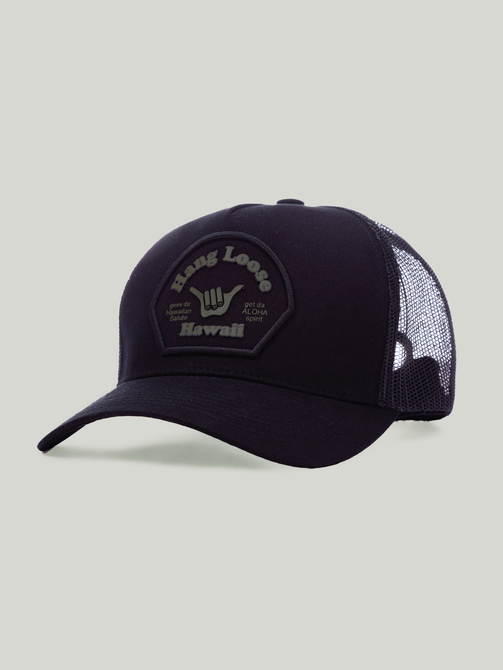 Boné Hang Loose Aloha Preto. Confeccionado em tecido Sarja de algodão, o boné Aloha possui modelo trucker, ajustador traseiro de plástico, etiqueta patch, silk em relevo com bordado, etiquetas Hang Loose e viés interno personalizado