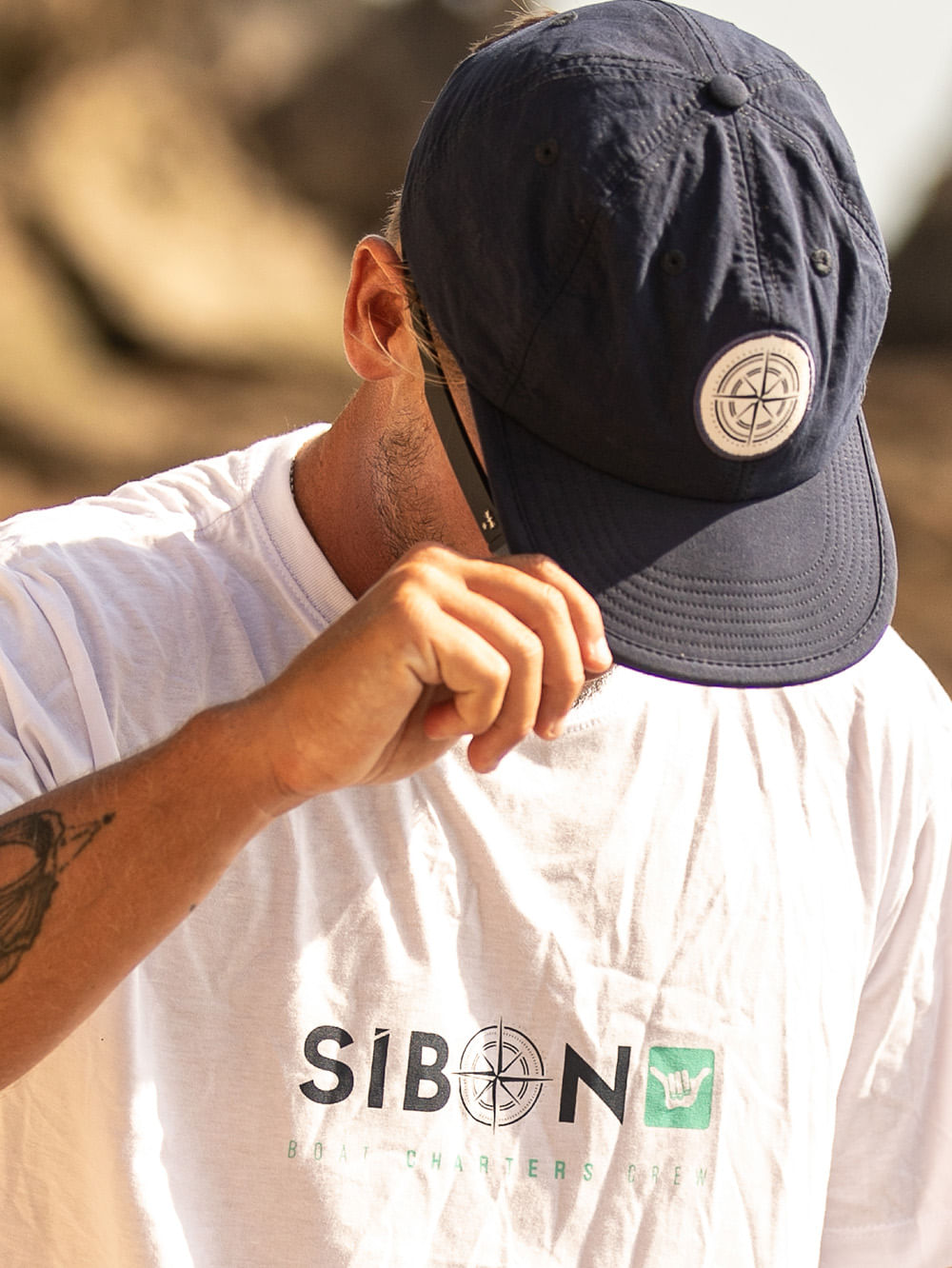 O boné azul marinho foi criado a partir da collab Hang Loose x Sibon Charters.