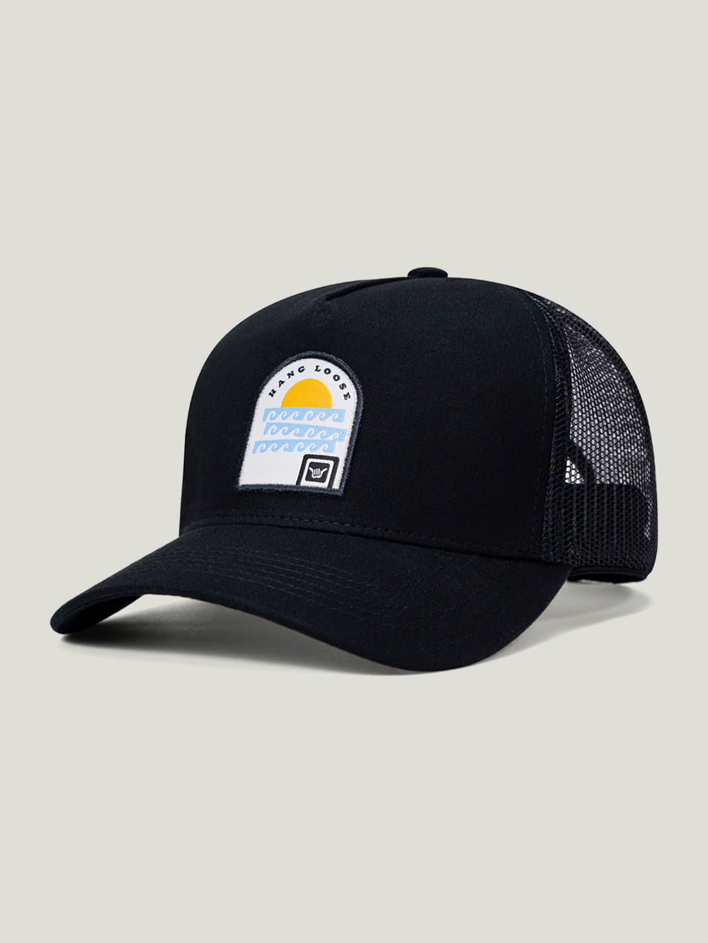 Boné Hang Loose Trucker, possui modelagem trucker snapback, aplicação de etiqueta frontal e etiquetas Hang Loose.