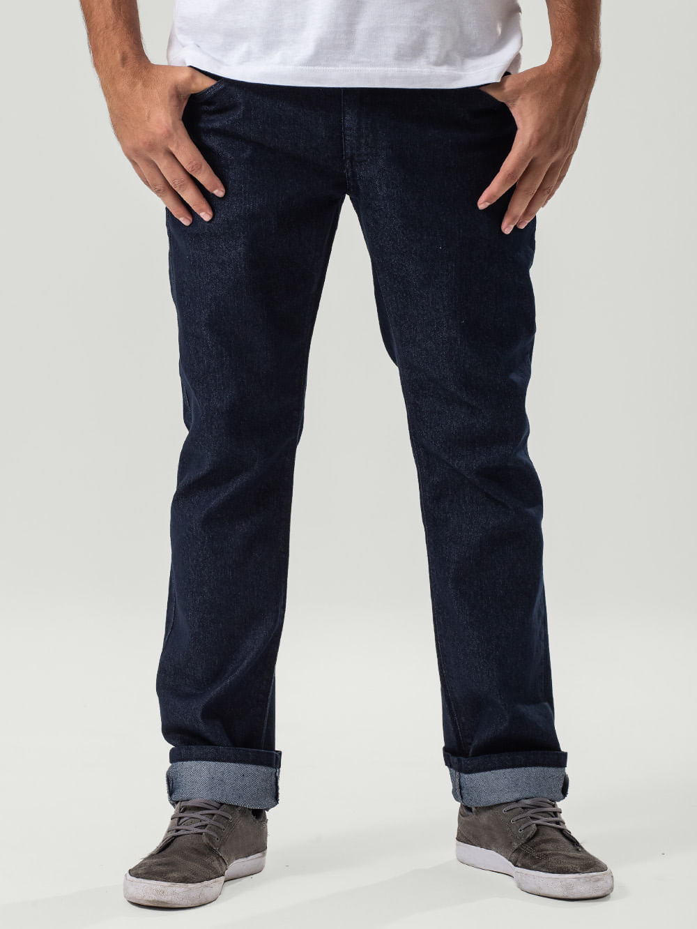 Calça Jeans Hang Loose Dark Blue confeccionada em algodão, poliéster e elastano. Possui etiqueta de couro no cós traseiro da calça.
