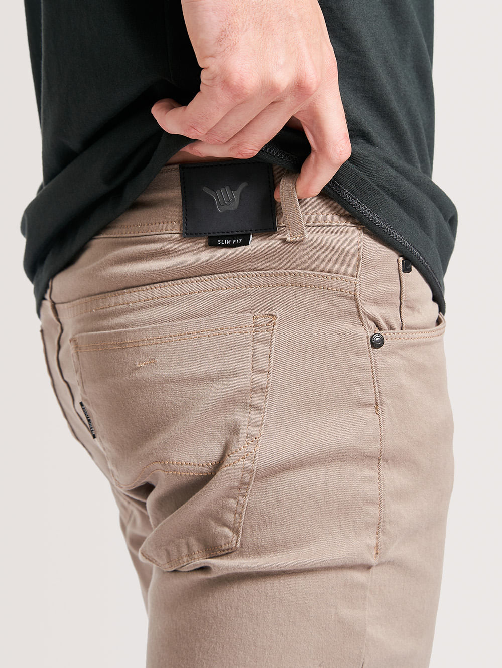 Calça Sarja Hang Loose 5 Pockets, possui modelagem slim fit e etiqueta Hang Loose em couro marrom. Confeccionada em tecido algodão e elastano,