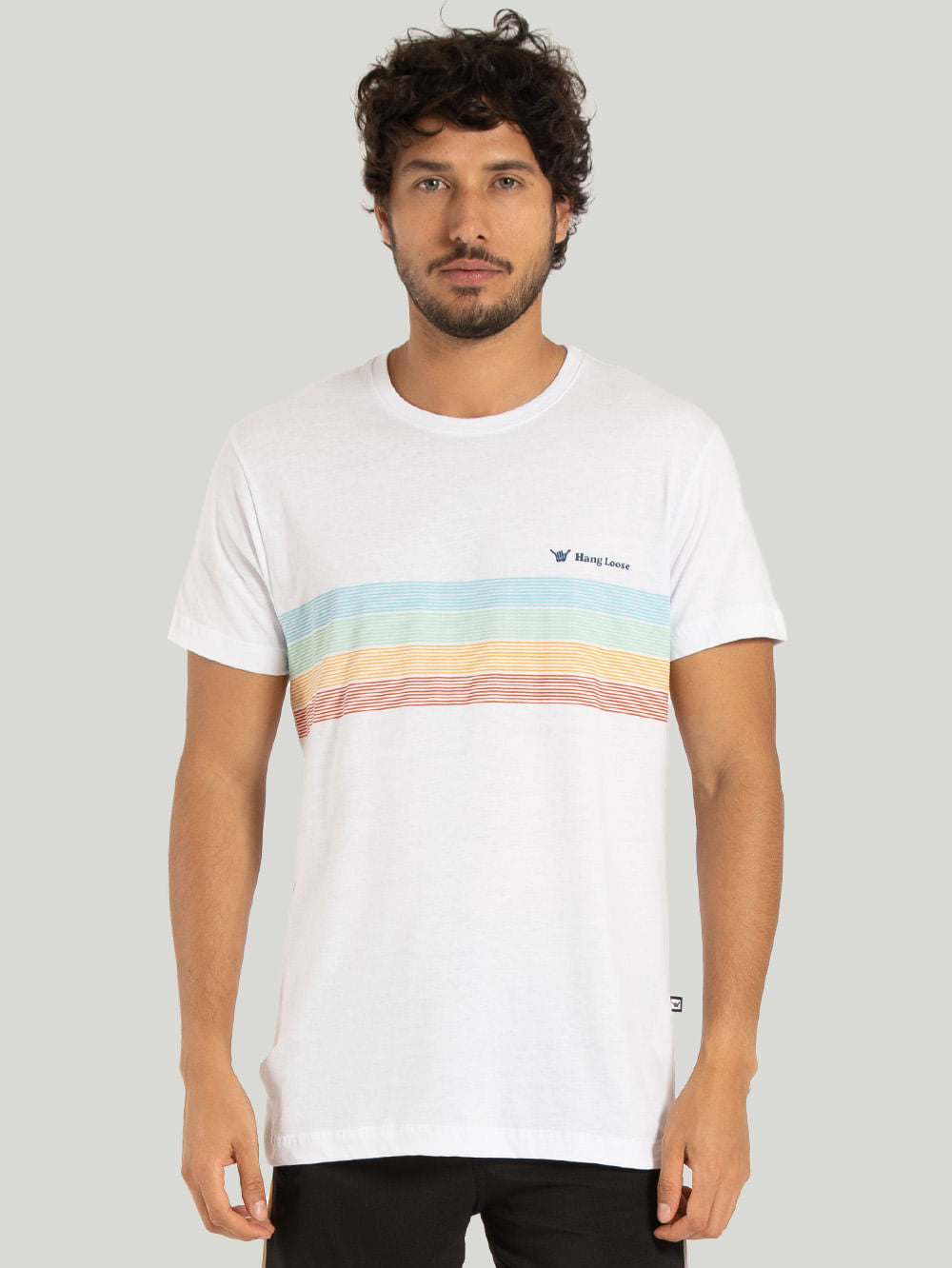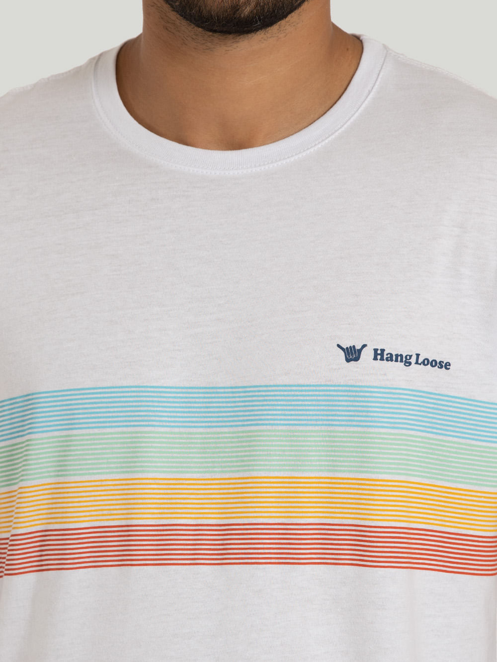 Camiseta Hang Loose Happy, confeccionada em tecido ½ malha diferenciada. Possui silk faixa no lado avesso da peça e etiquetas Hang Loose.