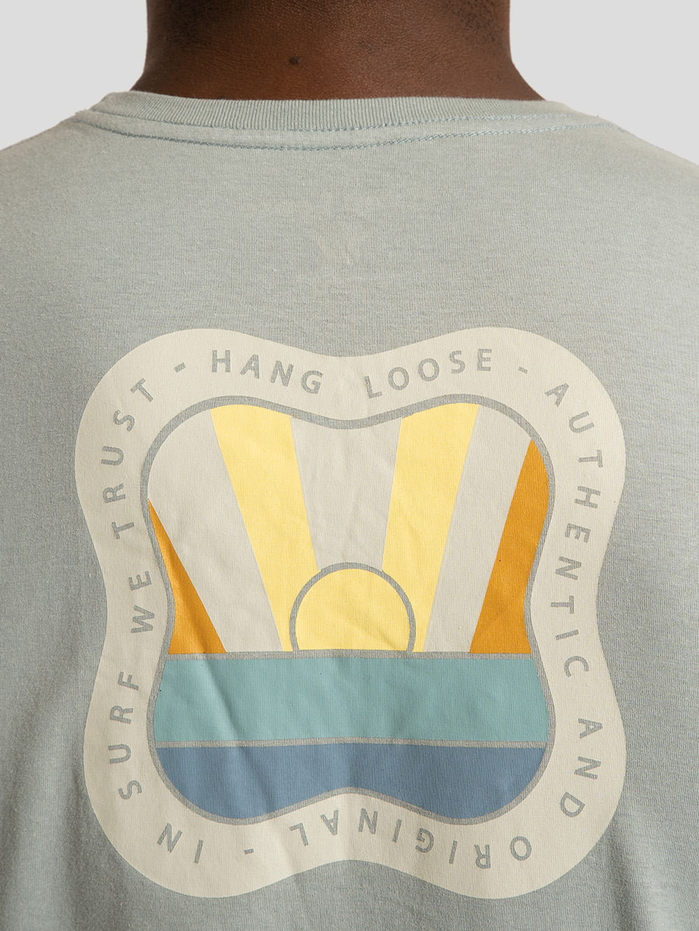 A Camiseta Hang Loose Laplaya é feita em 1/2 malha 30/1, possui silk frontal de cor única, silk nas costas de 5 cores e etiqueta Hang Loose.