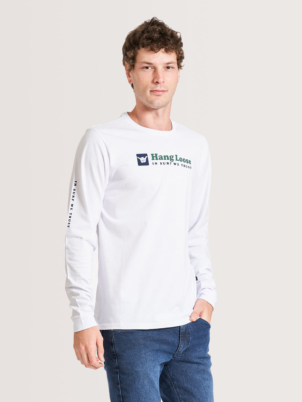 Camiseta Manga Longa Hang Loose Guide, possui estampa em silk frontal, costas e na manga, punho na manga e etiqueta Hang Loose aplicada na lateral.