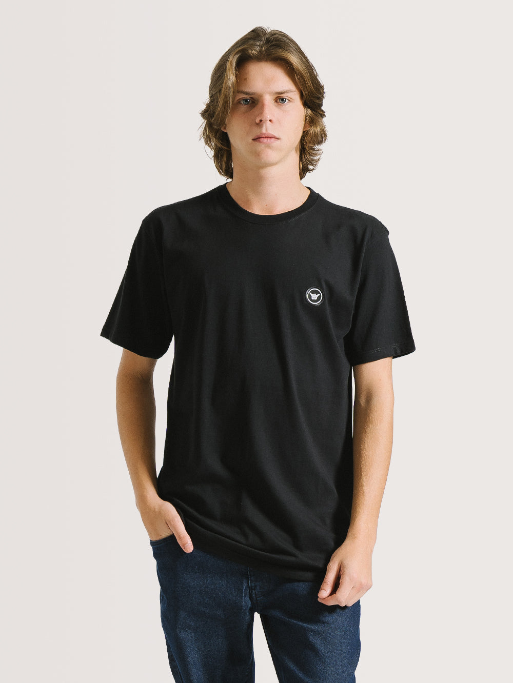 Camiseta Hang Loose Logolabel, possui etiqueta redonda aplicada na parte frontal e etiqueta Hang Loose na lateral. Confeccionada em tecido meia malha 30/1.
