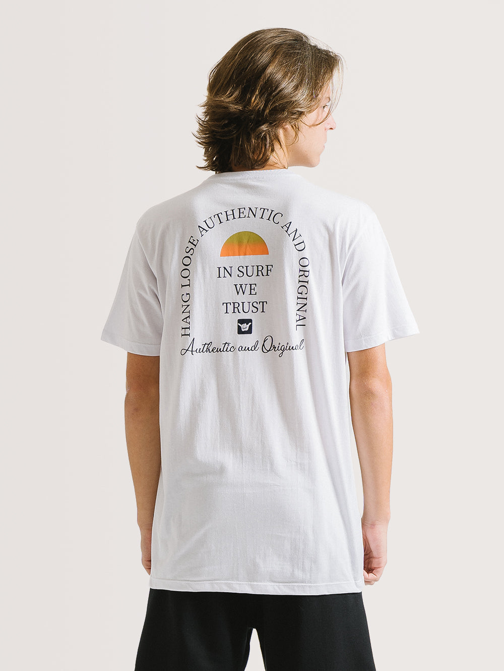 Camiseta Hang Loose Sunshine, possui estampa em silk frontal e nas costas e etiquetas Hang Loose. Confeccionada em tecido meia malha 30/1.