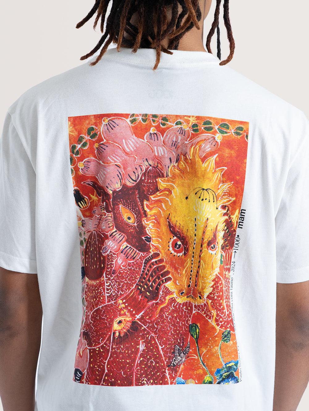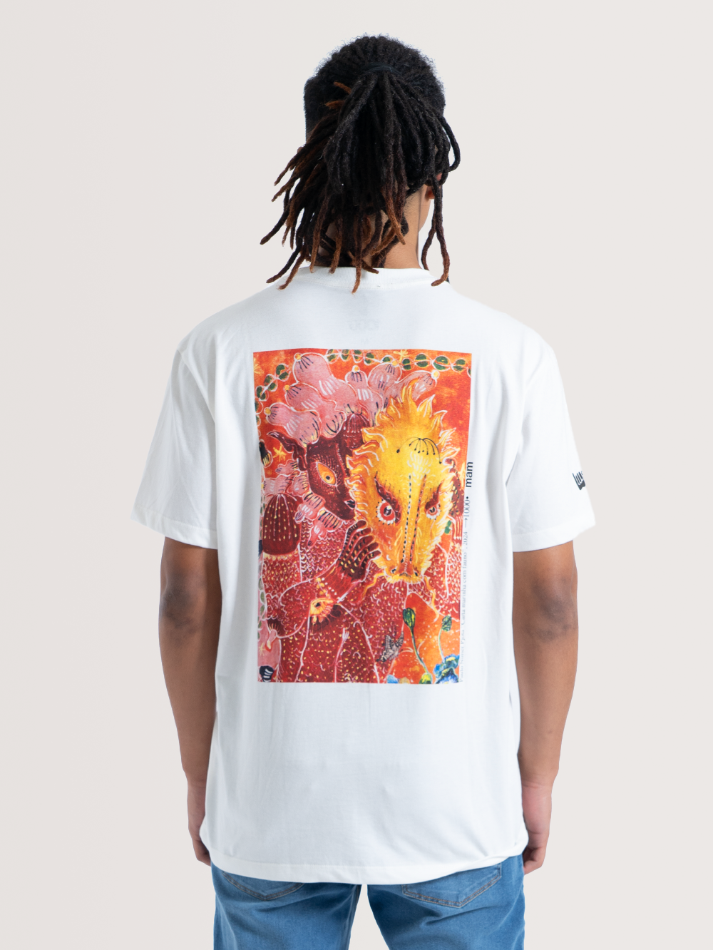 A Camiseta Hang Loose x Mam x PJota apresenta um fragmento da obra ""Carta Marinha com Fauno"" (2024), traduzindo essa rica iconografia para o universo da moda. Confeccionada em meia malha ecológica, a peça alia arte contemporânea e sustentabilidade.