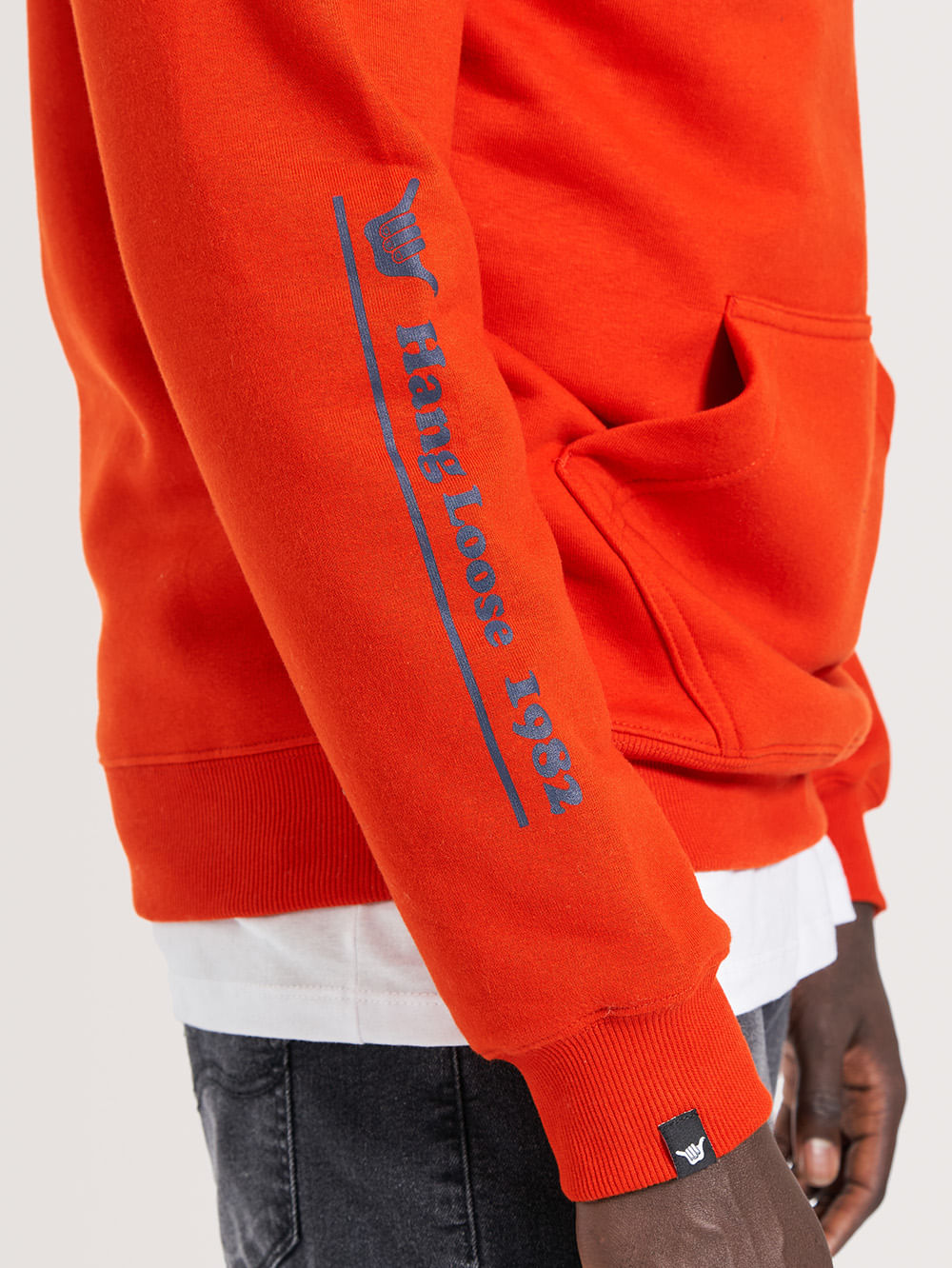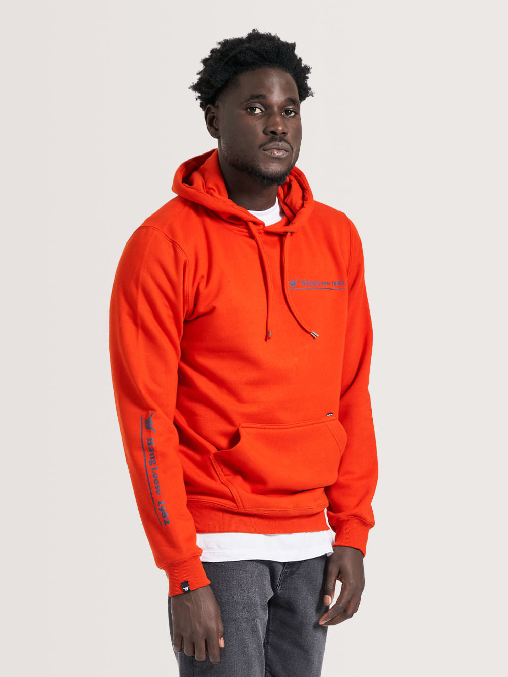 Moletom Canguru Hang Loose Peace. Possui capuz, bolso canguru, estampa em silk frontal e na manga, ilhós e ponteira personalizada, aplicação de etiqueta nas costas e etiquetas Hang Loose. Confeccionado em tecido felpado 320gramas.