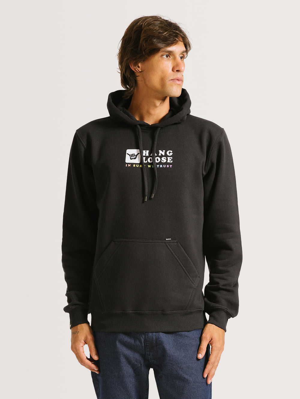 Moletom Canguru Hang Loose Rainbow. Possui capuz, bolso canguru, estampa em silk frontal degradê, ilhós e ponteira personalizada, aplicação de etiqueta nas costas e etiquetas Hang Loose. Confeccionado em tecido felpado 320gramas.