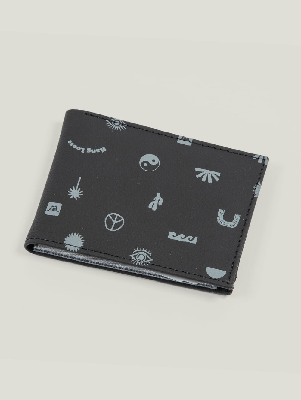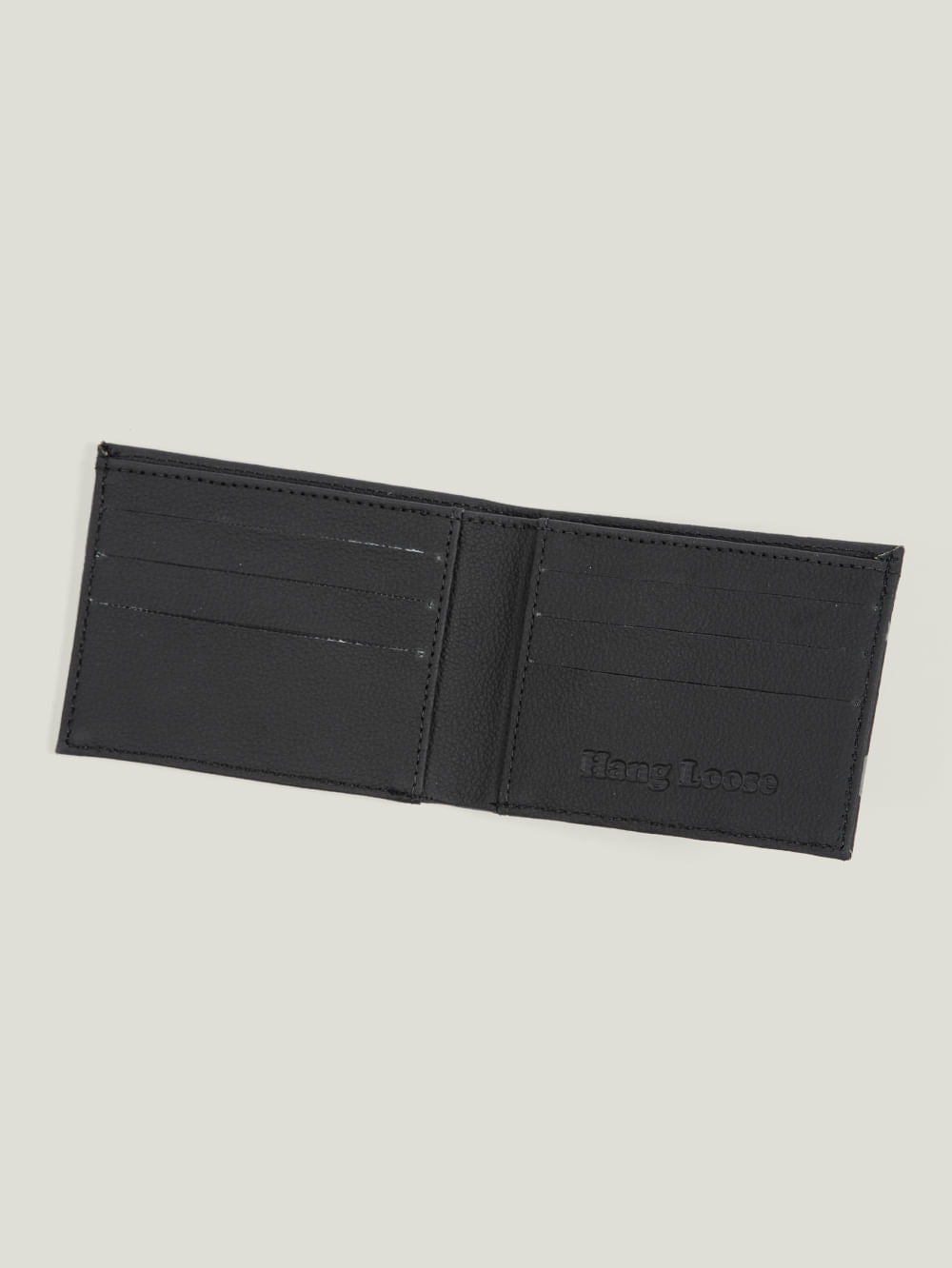 A Carteira Hang Loose Mini é feita de couro sintético estampado, possui divisórias internas para cartões, plástico para documentos destacável e aplicação metal Hang Loose.