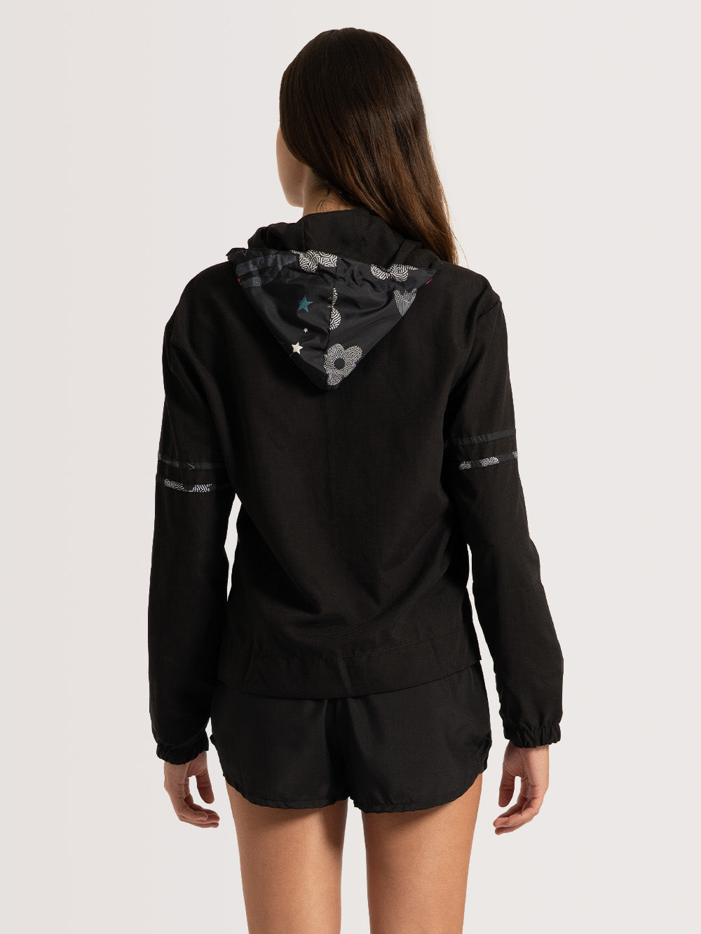 Jaqueta Corta Vento Hang Loose Flower. Possui cordão regulador no capuz, estampa Flower no capuz, nas faixas das mangas e no recorte frontal.