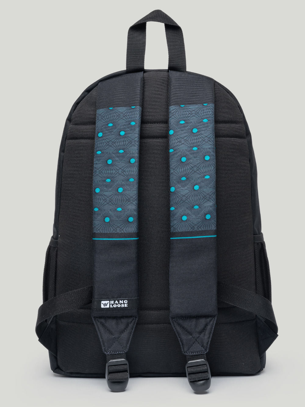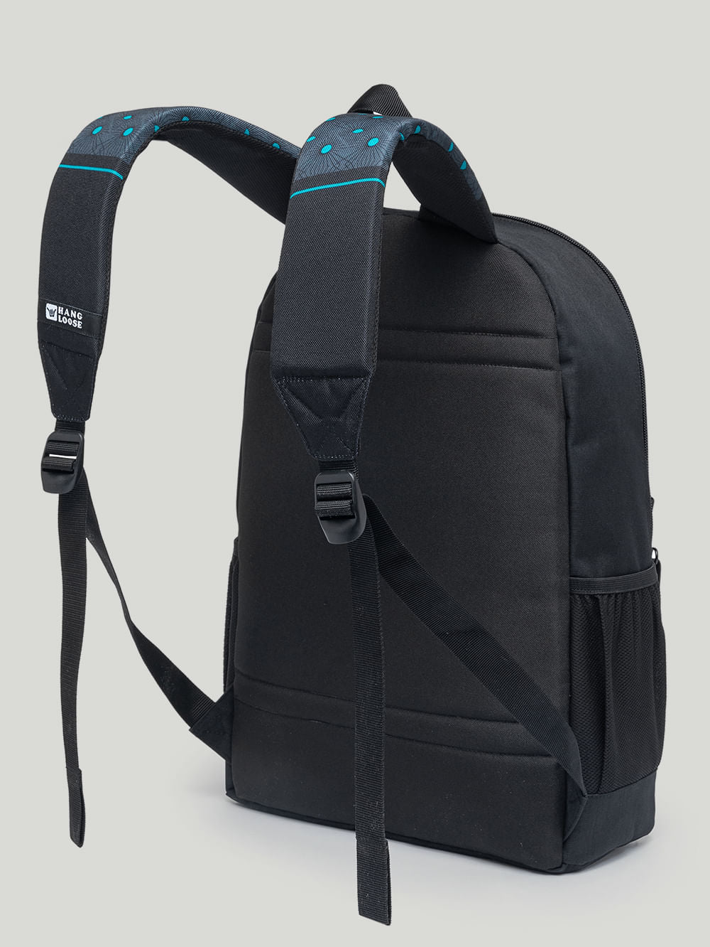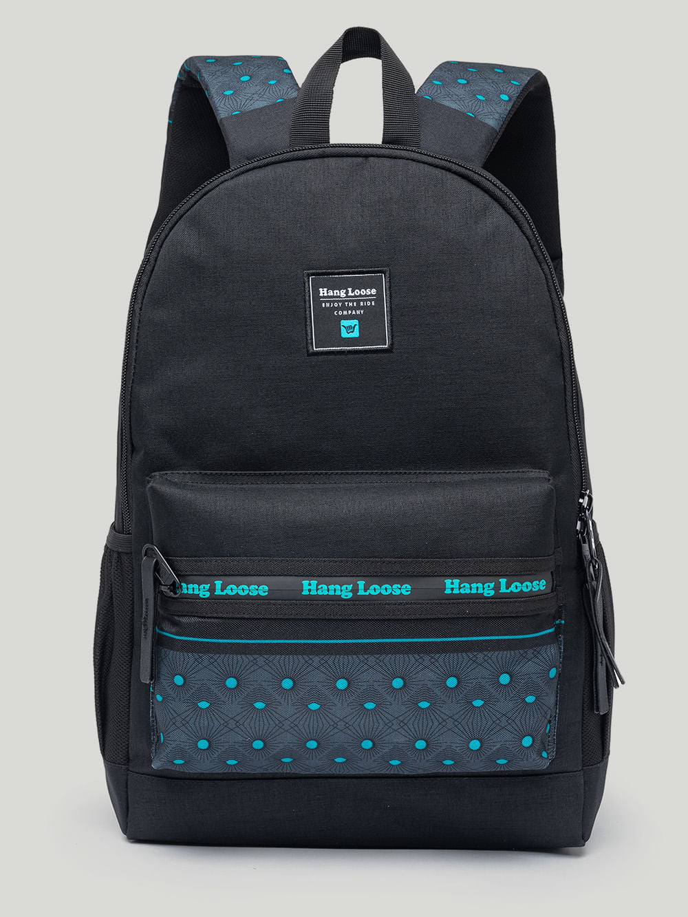 Mochila Hang Loose Mistic Preta. Confeccionada em poliéster texturizado. Conta com zípers personalizados, compartilhamento para notebook até 15,5 polegadas, estampa Hang Loose frontal e nas alças, aplicação de etiquetas e múltiplos bolsos. Possui 43 cm de altura, 30 cm de largura e 15 cm de profundidade, com capacidade de 19,5 litros.