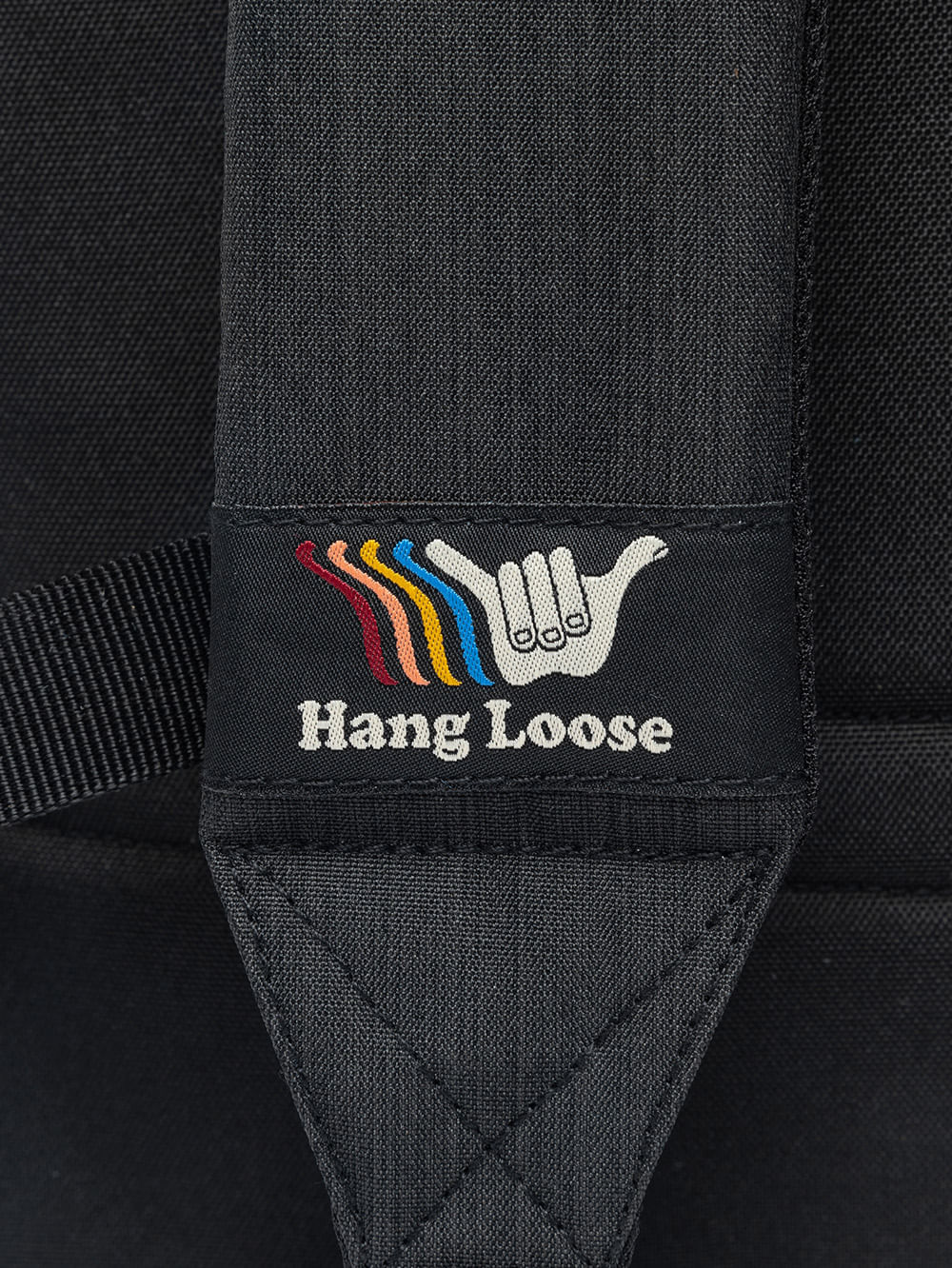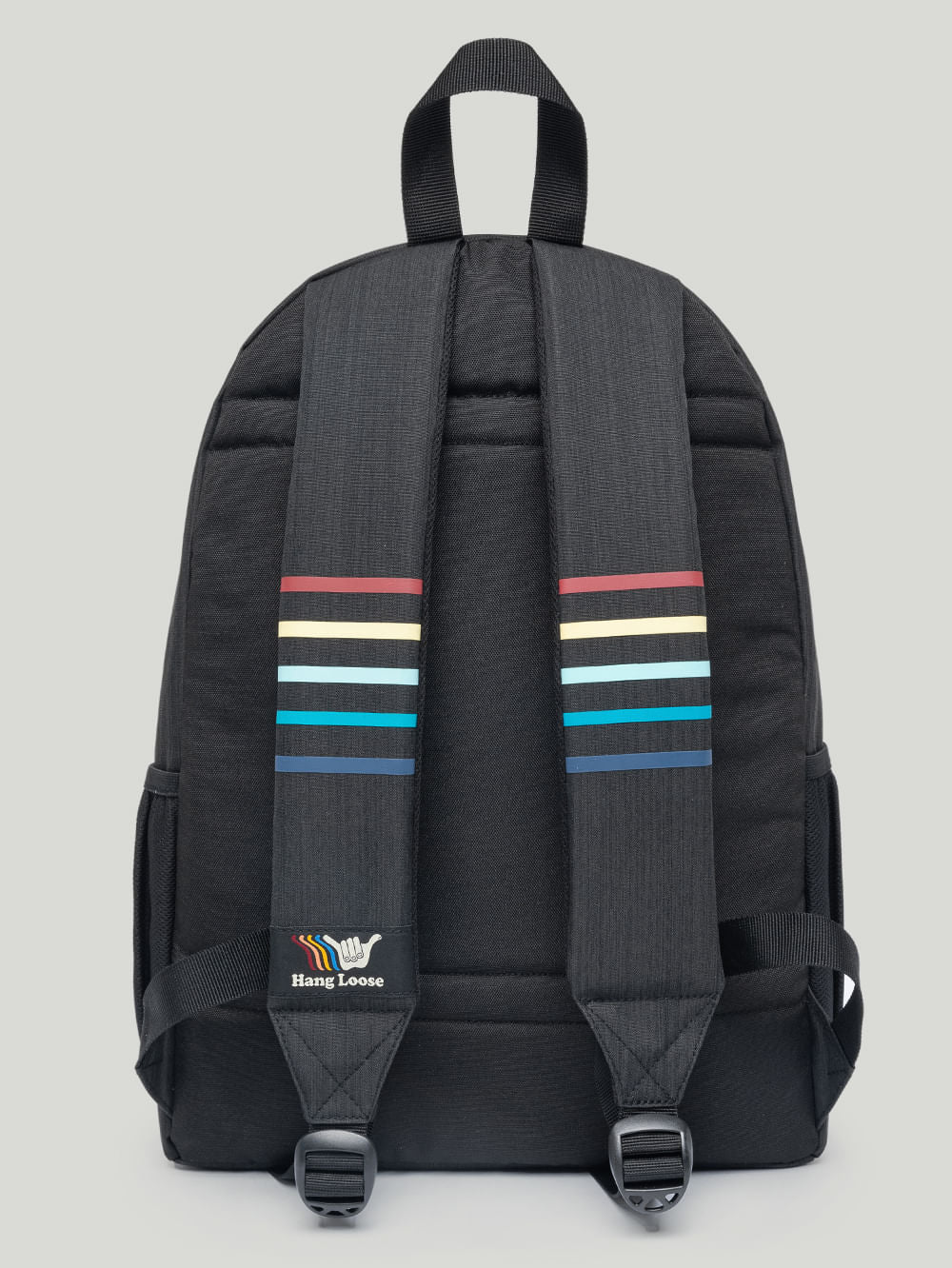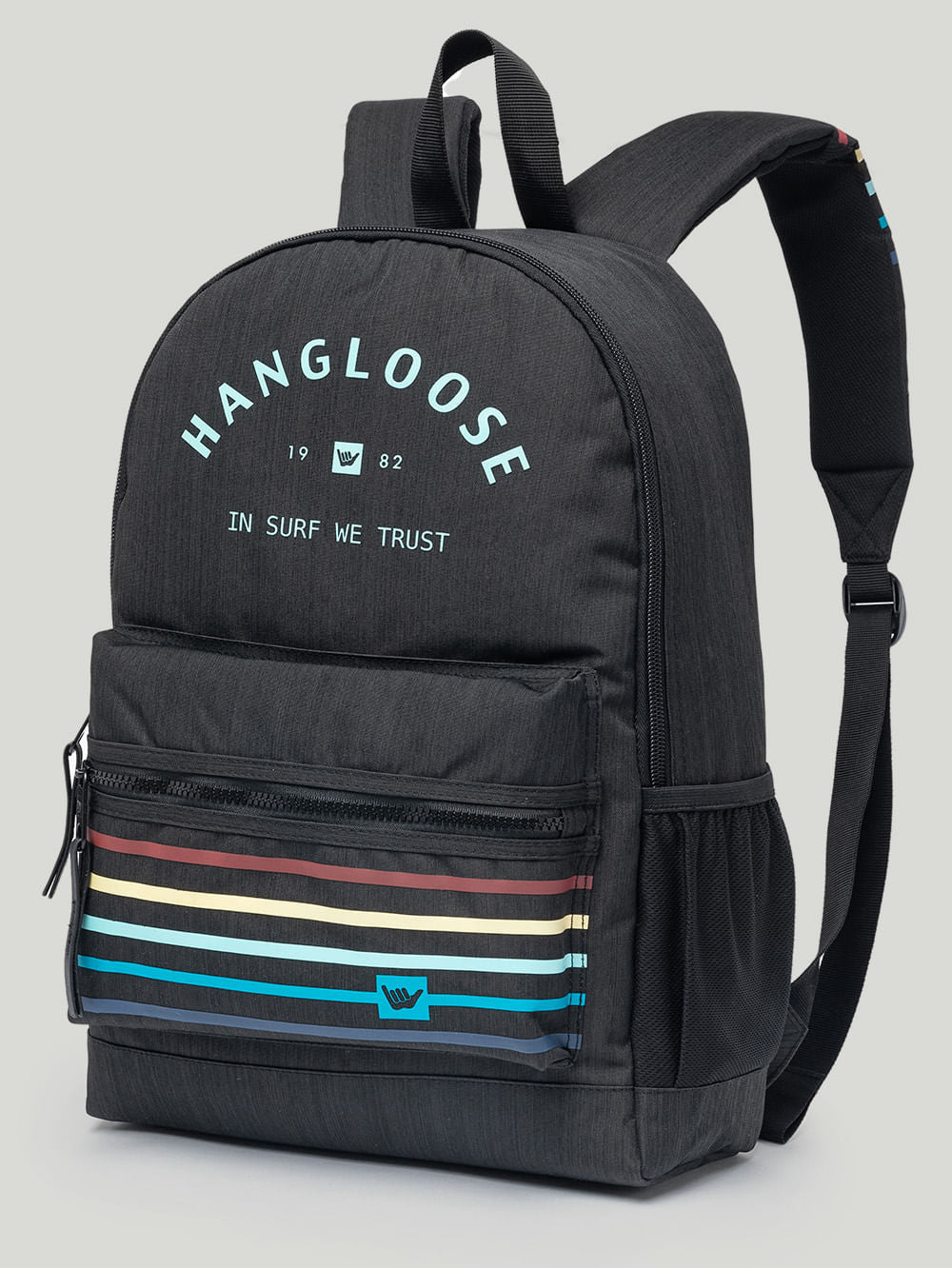 Mochila Hang Loose Retrostripe Preta. Confeccionada em algodão. Conta com zípers personalizados, compartilhamento para notebook até 16 polegadas, estampa Hang Loose frontal e nas alças, aplicação de etiquetas e múltiplos bolsos. Possui 45 cm de altura, 31 cm de largura e 15 cm de profundidade, com capacidade de 21 litros.