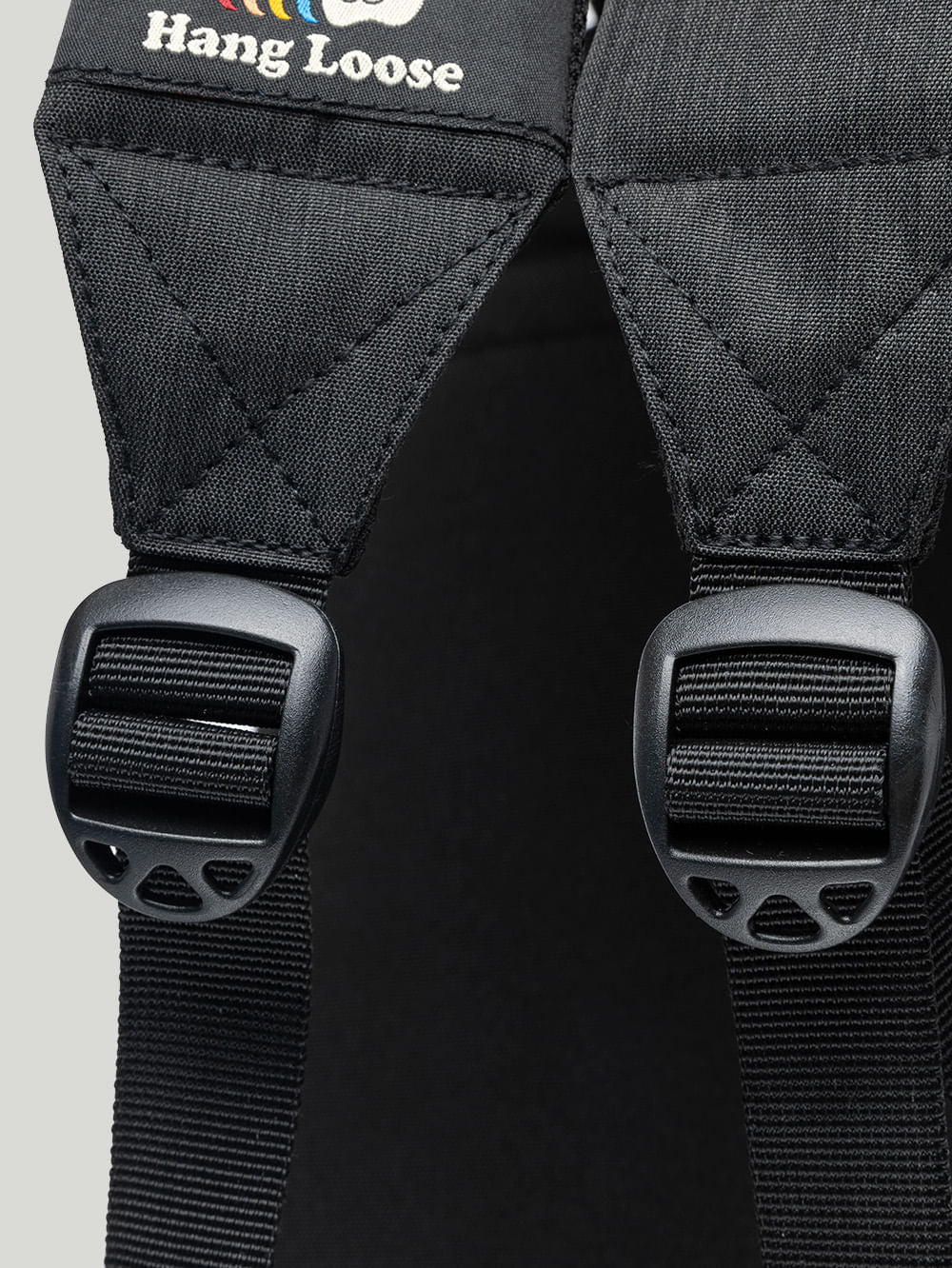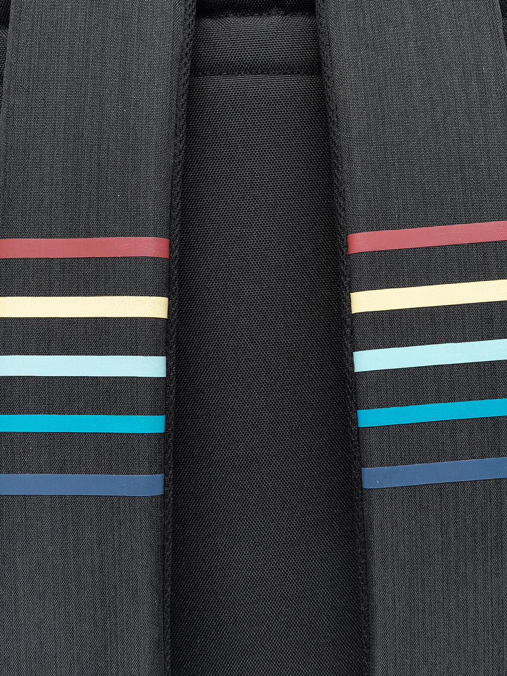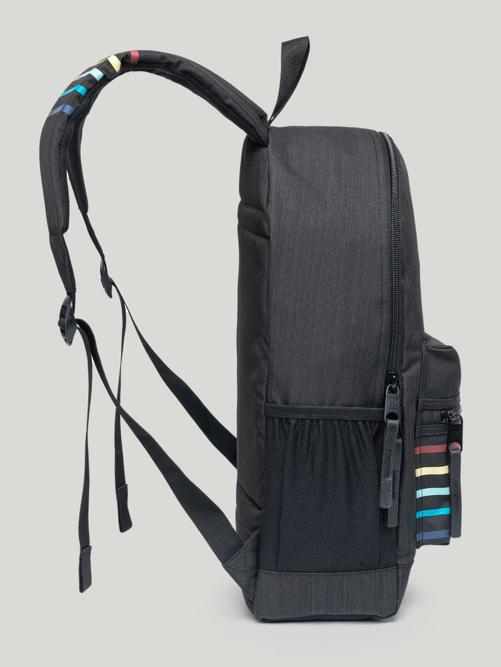 Mochila Hang Loose Retrostripe Preta. Confeccionada em algodão. Conta com zípers personalizados, compartilhamento para notebook até 16 polegadas, estampa Hang Loose frontal e nas alças, aplicação de etiquetas e múltiplos bolsos. Possui 45 cm de altura, 31 cm de largura e 15 cm de profundidade, com capacidade de 21 litros.
