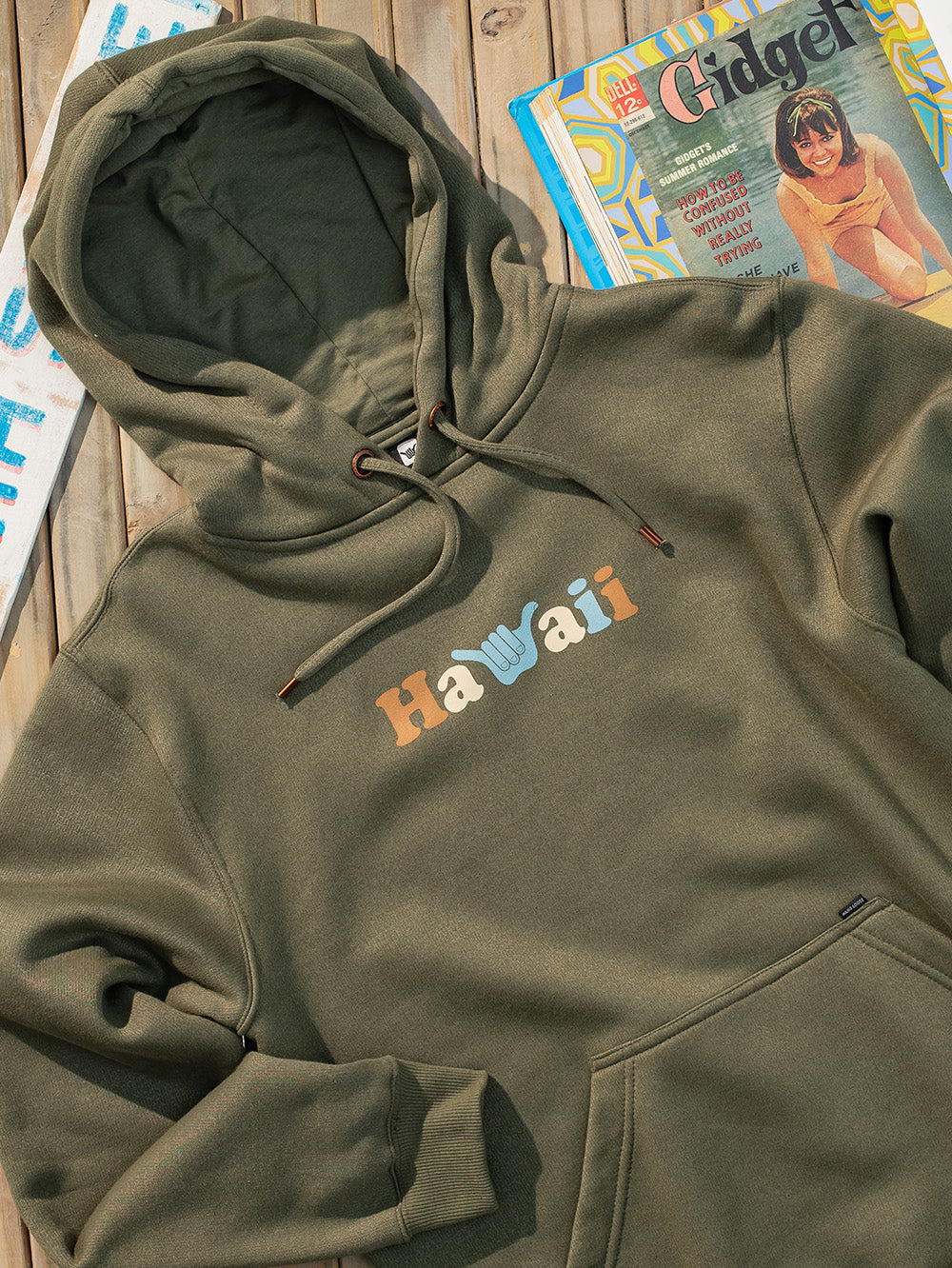 Moletom Canguru Hang Loose Hawaii. Possui capuz, bolso canguru, estampa em silk frontal e no capuz, ilhós personalizado, aplicação de etiqueta nas costas e etiquetas Hang Loose. Confeccionado em tecido felpado 320gramas.