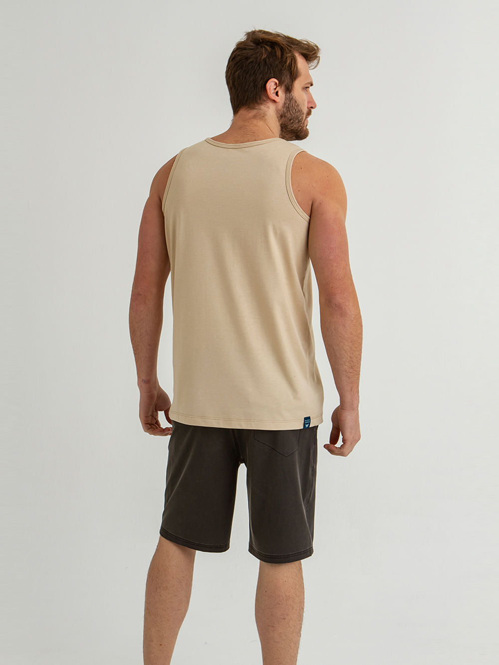 Regata Hang Loose Eco Logo Bege. Confeccionada em meia malha de algodão, a regata Eco Logo possui silk frontal e etiqueta Hang Loose.