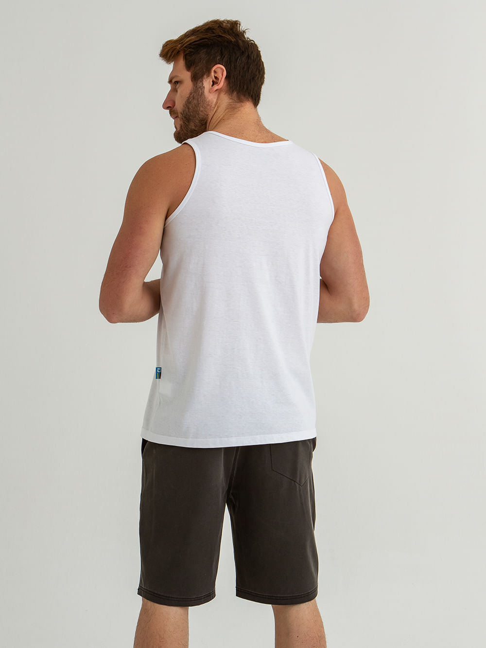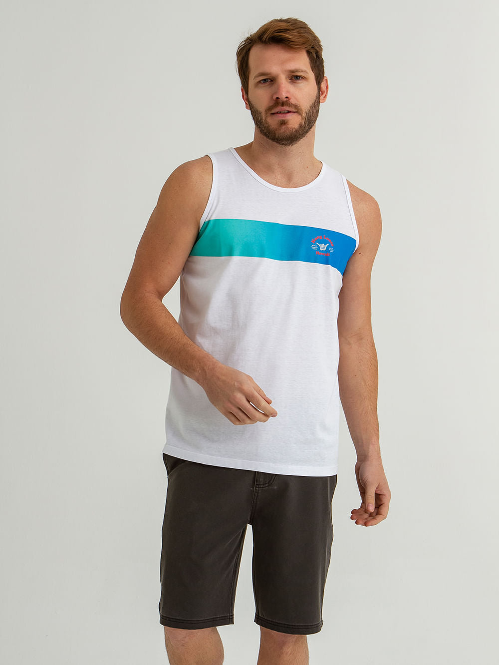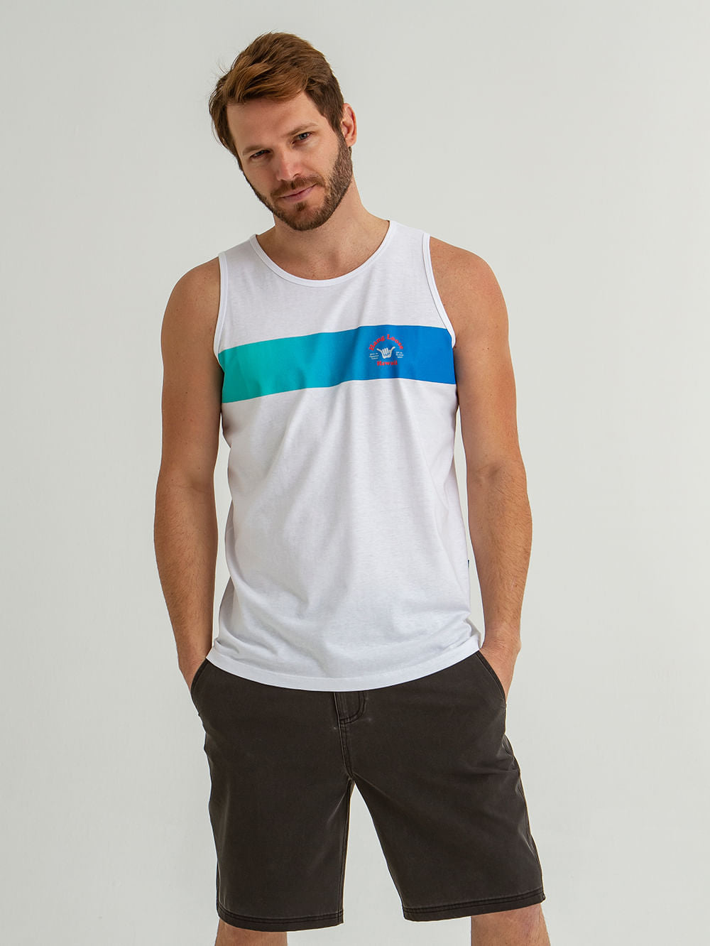Regata Hang Loose Ocean Branca. Confeccionada em meia malha de algodão, a regata Ocean possui silk frontal com degradê e etiqueta Hang Loose.